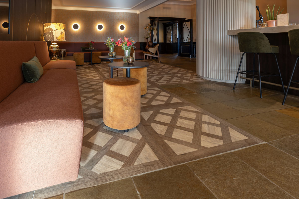 Het parketpatroon markeert het loungegedeelte als een eigen eiland en verbindt het eigentijdse interieur met het klassieke karakter van het landgoed.