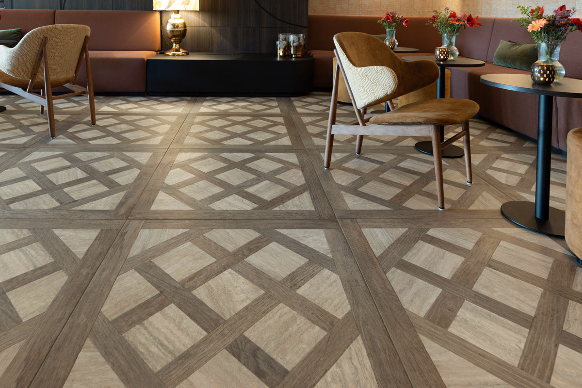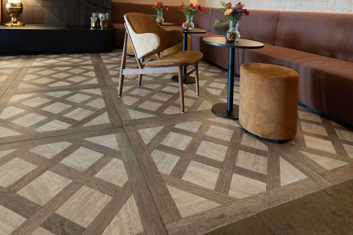 Voor de renovatie van de lounge van Landgoed de Wilmbersberg in De Lutte mocht Cerriva de vloertegels leveren. De keuze viel op een houtlooktegel met een klassiek patroon dat aansluit bij het karakter van het landgoed en tegelijkertijd een warme, natuurlijke uitstraling geeft. Bij binnenkomst word je direct meegenomen in een levendige sfeer, waarin strakke, moderne belijningen een spannend contrast vormen met de historische omgeving.