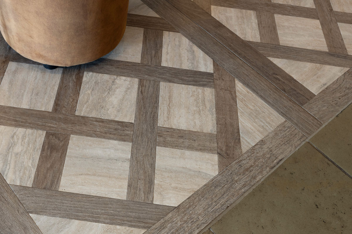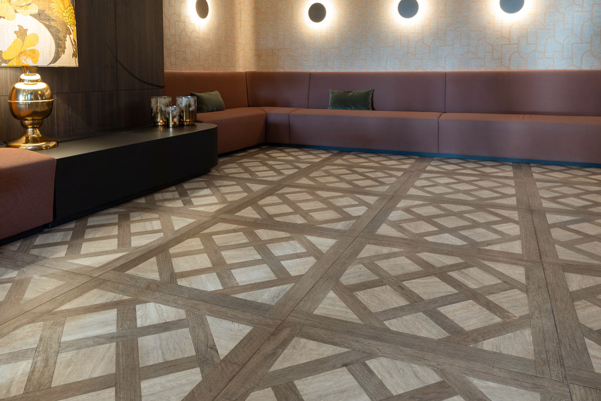 De lounge, gelegen naast de bar, is een plek waar gasten kunnen koffiedrinken na een lange wandeling door de prachtige natuur, of gewoon even ontspannen in een intieme setting tijdens hun hotelverblijf. Het keramische parket ‘Sant Agostino Yorkwood Classic’ voegt warmte en karakter toe en versterkt de gezellige, historische sfeer van het interieur. De serie is geïnspireerd op de romantische uitstraling van Engelse landhuizen. De houtlook, gecombineerd met travertin, vormt samen een tijdloos geheel.
