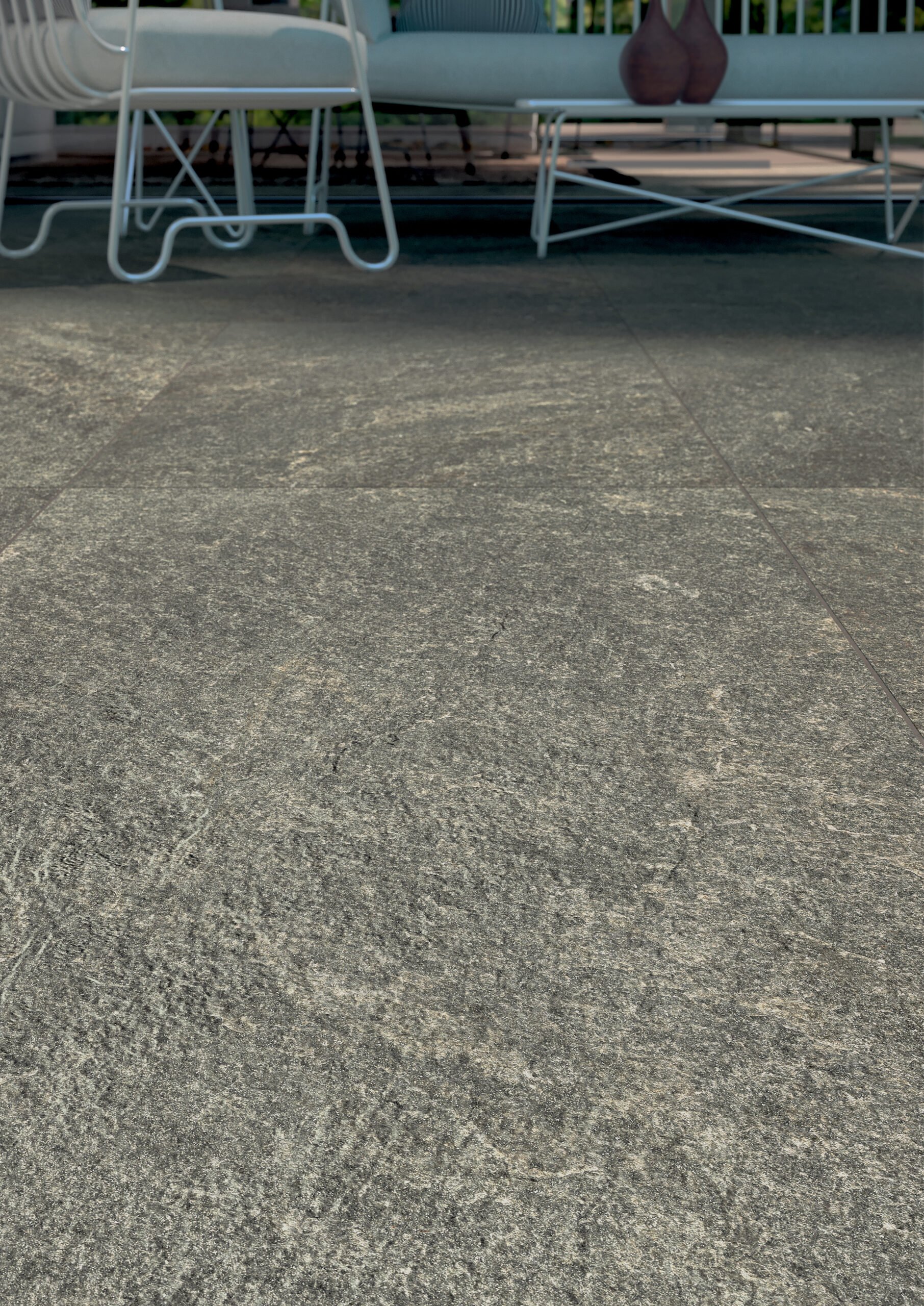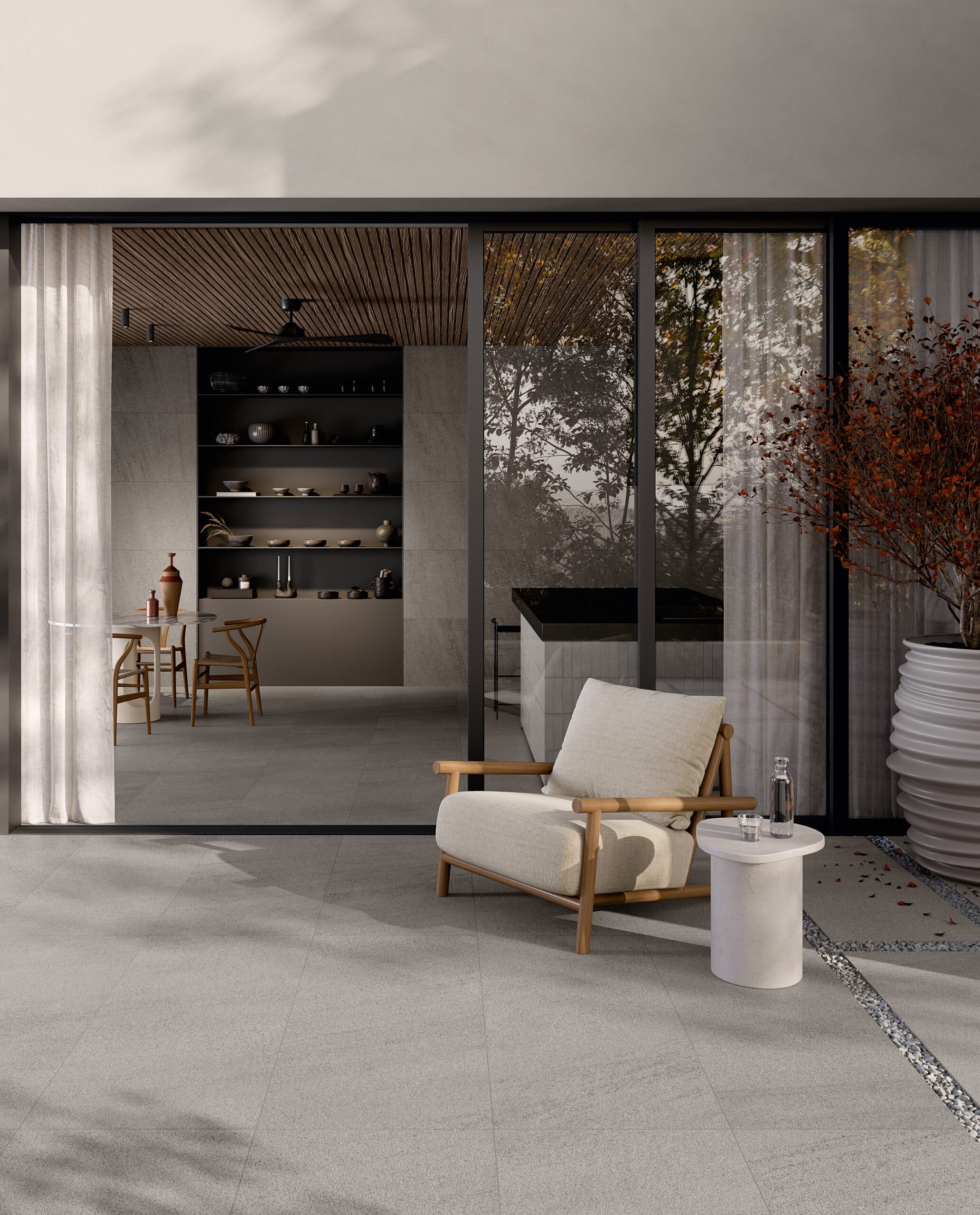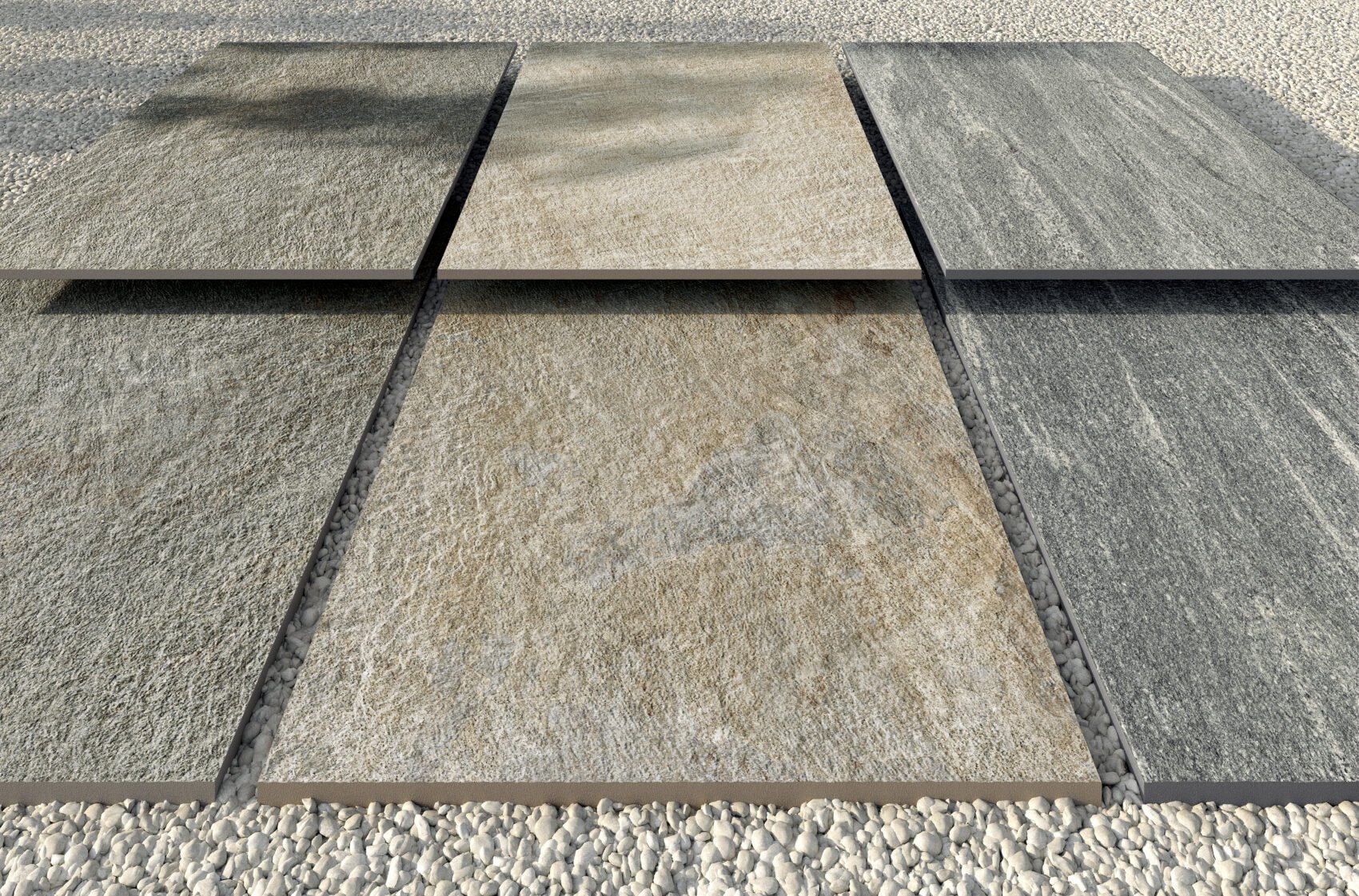 Voor buitengebruik speelt de afwerking een belangrijke rol. Veel outdoortegels hebben een structuur die zorgt voor extra grip. Denk aan bocciardata, hammered, rolled of een gestructureerde naturale-afwerking. Deze zijn niet alleen visueel aantrekkelijk, maar verhogen ook de slipweerstand.