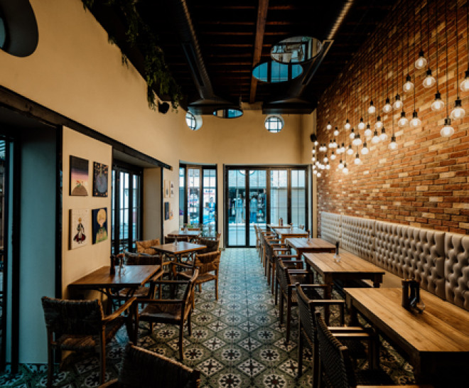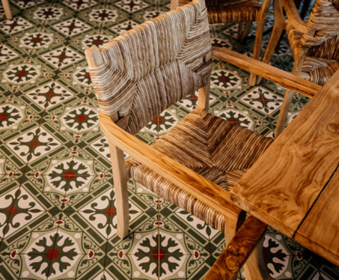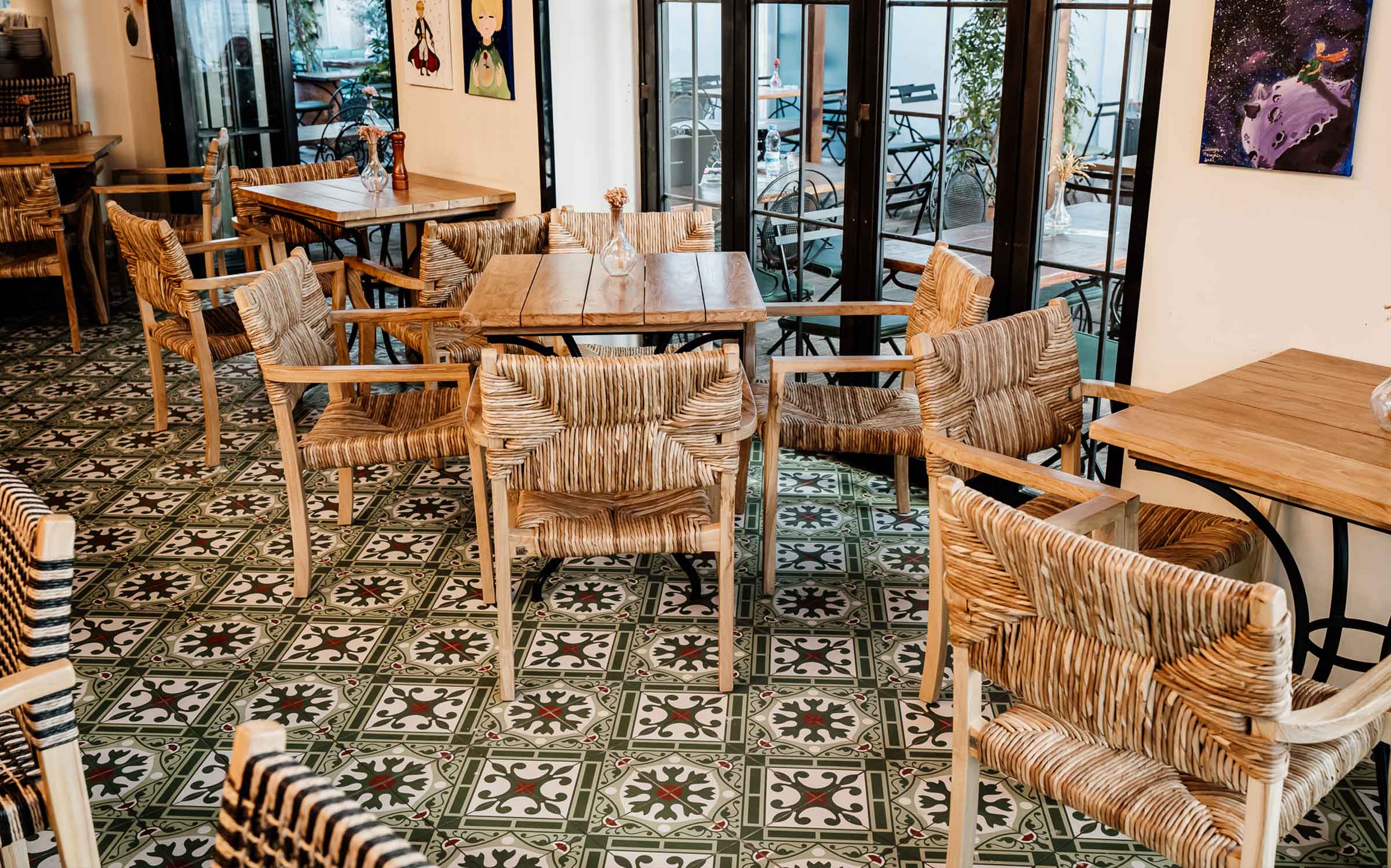 Voor dit project is gekozen voor een decoratieve keramische tegel die uitstraling en functionaliteit combineert. Het patroon geeft het interieur een sterke visuele basis, terwijl het materiaal zorgt voor duurzaamheid en eenvoudig onderhoud. Iets dat essentieel is in een dynamische horecaomgeving.