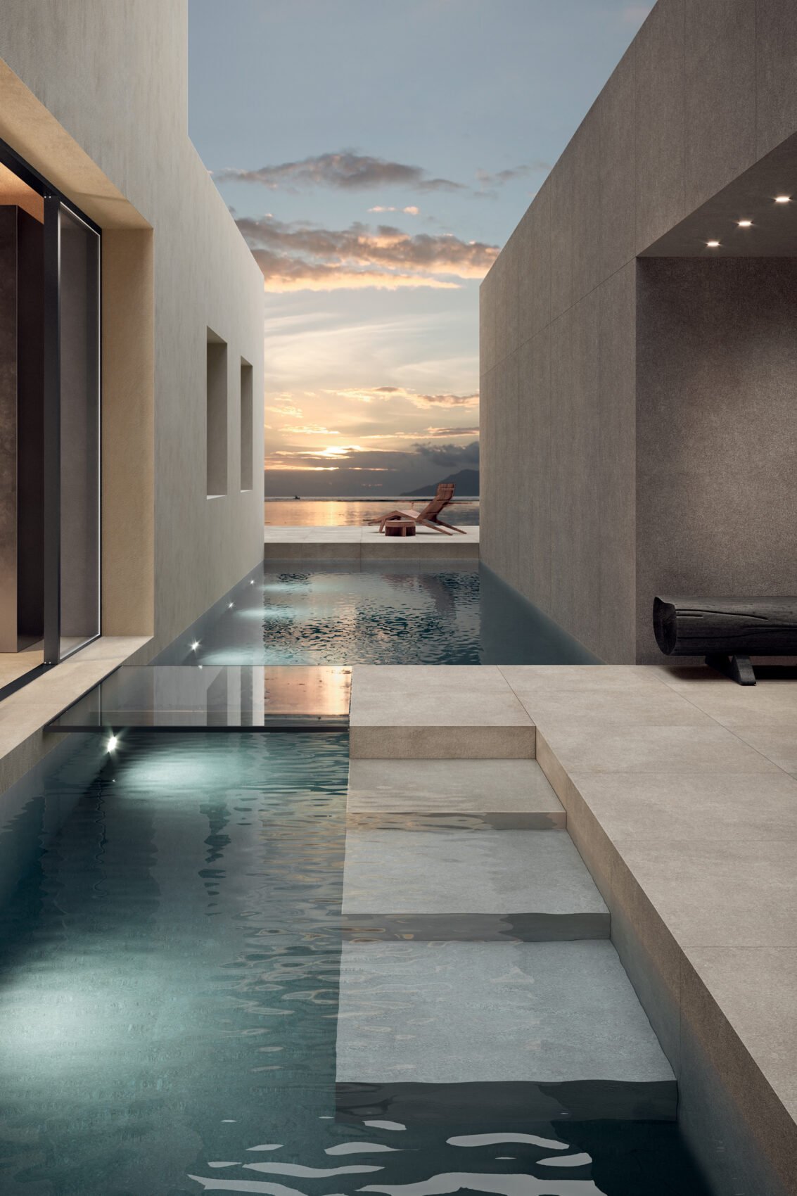 Steeds vaker ontwerpen architecten woonomgevingen die in elkaar overvloeien: van binnen naar buiten, van terras naar zwembad, of juist van spa naar wellnessruimte. Door ook de zwembadrand uit te voeren in keramiek, ontstaat er een visuele eenheid. De vloer loopt als het ware door tot in het water – zonder onderbreking in materiaal, kleur of textuur. Zeker bij luxe woningen of hotels zorgt dit voor rust, eenheid en een hoogwaardige uitstraling. Keramiek leent zich hier perfect voor: het is strak, stijlvol en leverbaar in uiteenlopende looks zoals beton, natuursteen of marmer. En behoudt zijn kwaliteit; ook in natte-of buitentoepassingen.