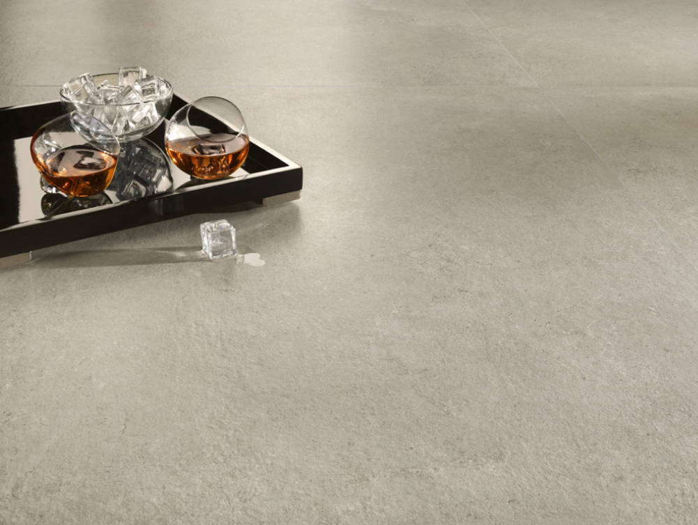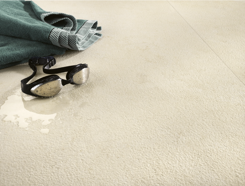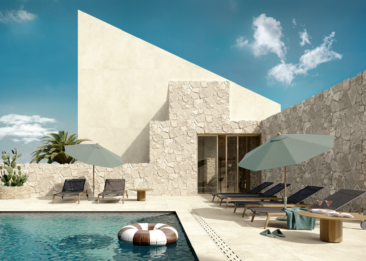 De serie bestaat uit vier zachte kleuren en drie diktes; zo kun je de tegel doorleggen van wand, naar vloer, naar buiten en zelfs naar het zwembad.